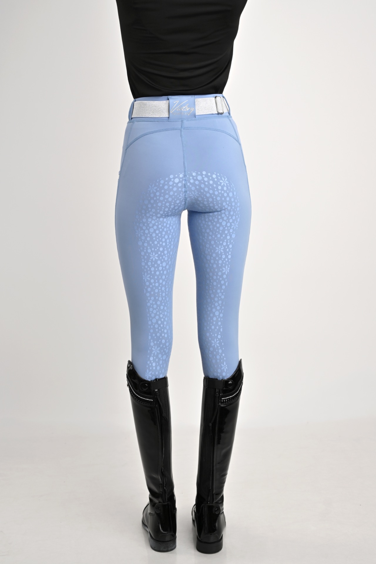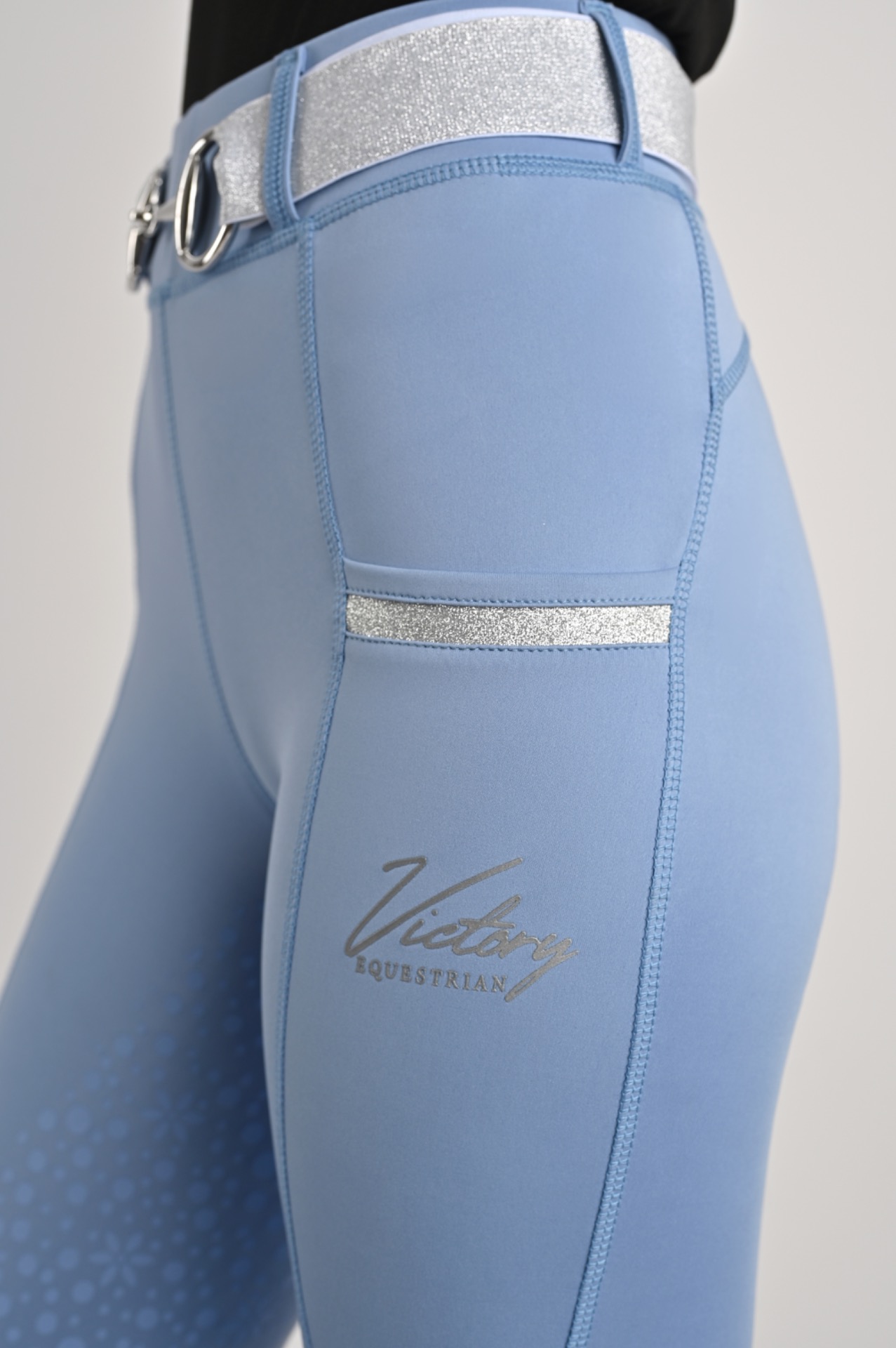 Babakék-ezüst lovaglónadrág, csillogós részletekkel. Kettő nagy telefontartó zsebbel és övtartóval.